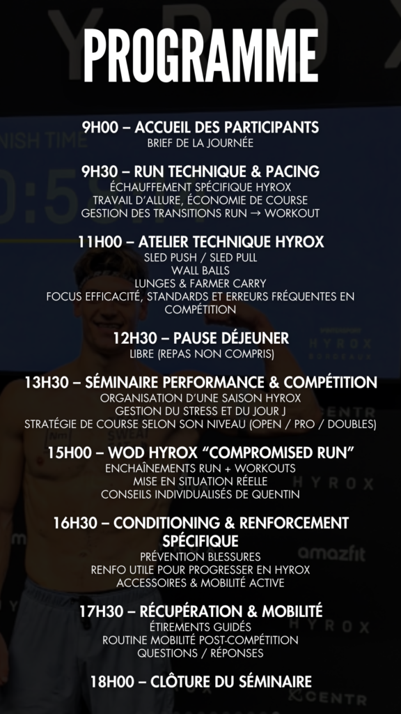 séminaire quentin garel Pour réserver votre place au séminaire HYROX, il vous suffit de suivre le lien ci-dessous. Pour bénéficier du tarif adhérent, écrivez-nous sur whatsapp